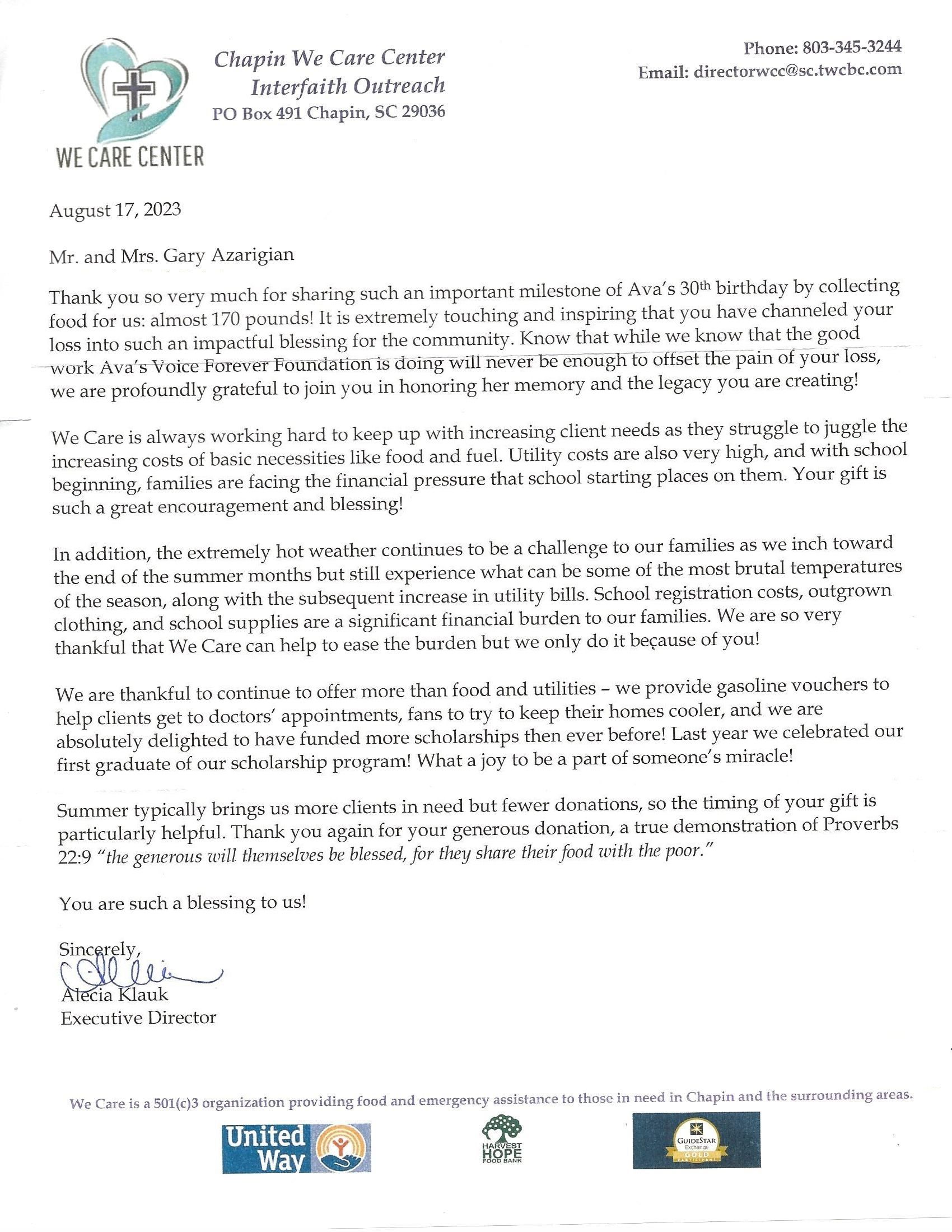 WE CARE CENTER, Food Drive. In memory of Alexis Azarigian, 30th birthday celebration, 8-4-2023